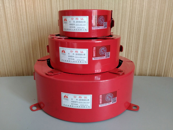 阻火圈產(chǎn)品由金屬外殼、防水內(nèi)殼和膨脹阻火芯材組成,安裝時套在UPVC管壁上,固定于樓板下表面或墻體兩側(cè)?;馂?zāi)發(fā)生時,阻火圈膨脹阻火芯材受熱迅速膨脹,向內(nèi)擠壓受熱軟化的電纜穿線管、硬聚氯乙烯管壁,在較短的時間內(nèi)封堵貫穿管道的洞口,阻火圈有效的阻止火焰沿洞口蔓延。因阻火圈在較潮濕的環(huán)境中使用,防火內(nèi)殼將有效的延長阻火圈的使用壽命。